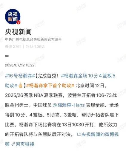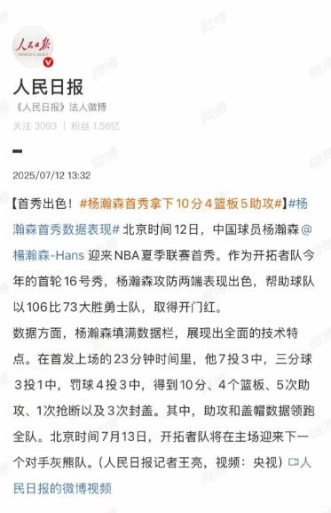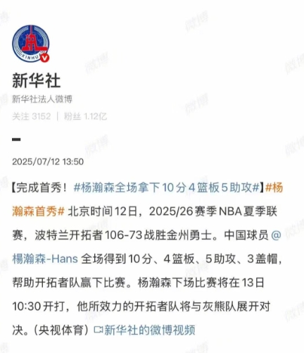 杨瀚森首秀的惊艳表现热度爆表,一度冲上热搜第二,同时也是引得媒体高度关注,一众官媒纷纷转发,包括央视频、新华社、人民日报等媒体。